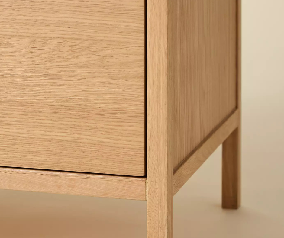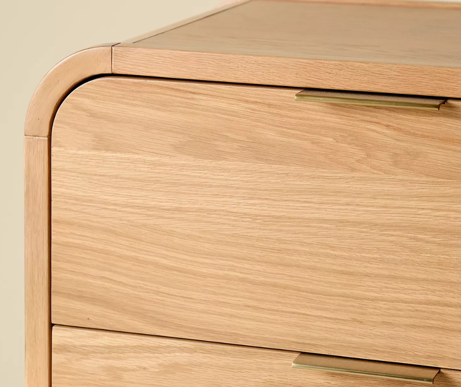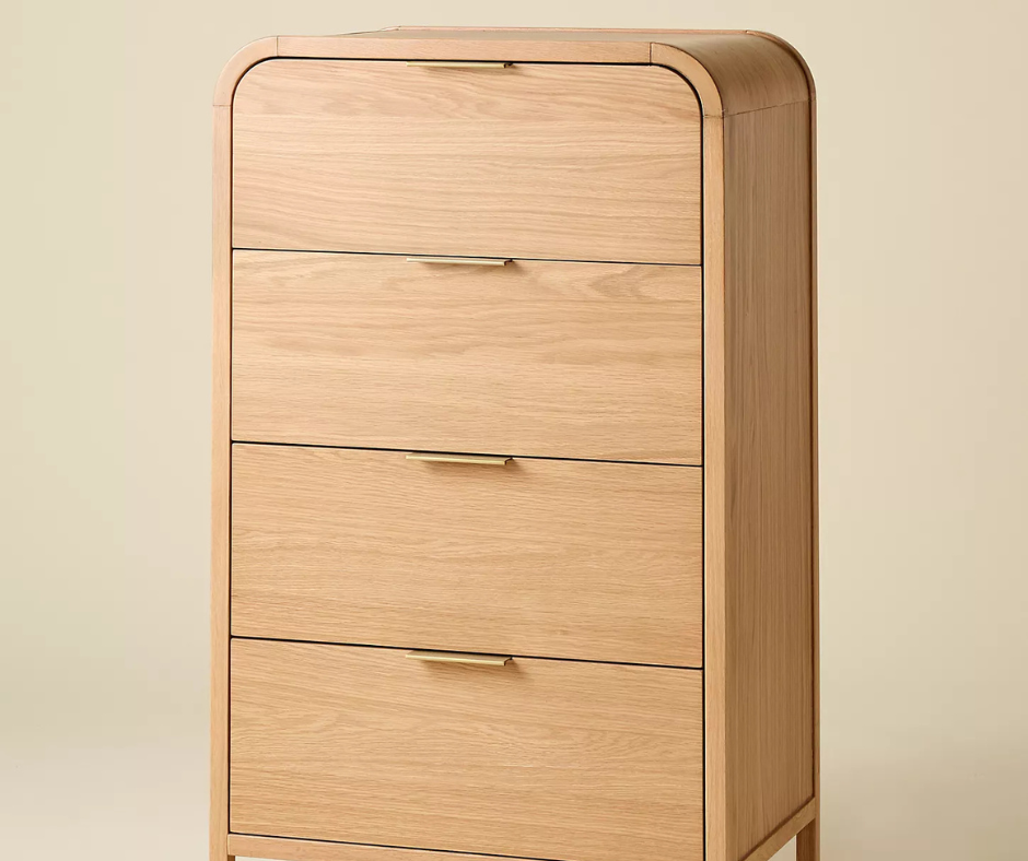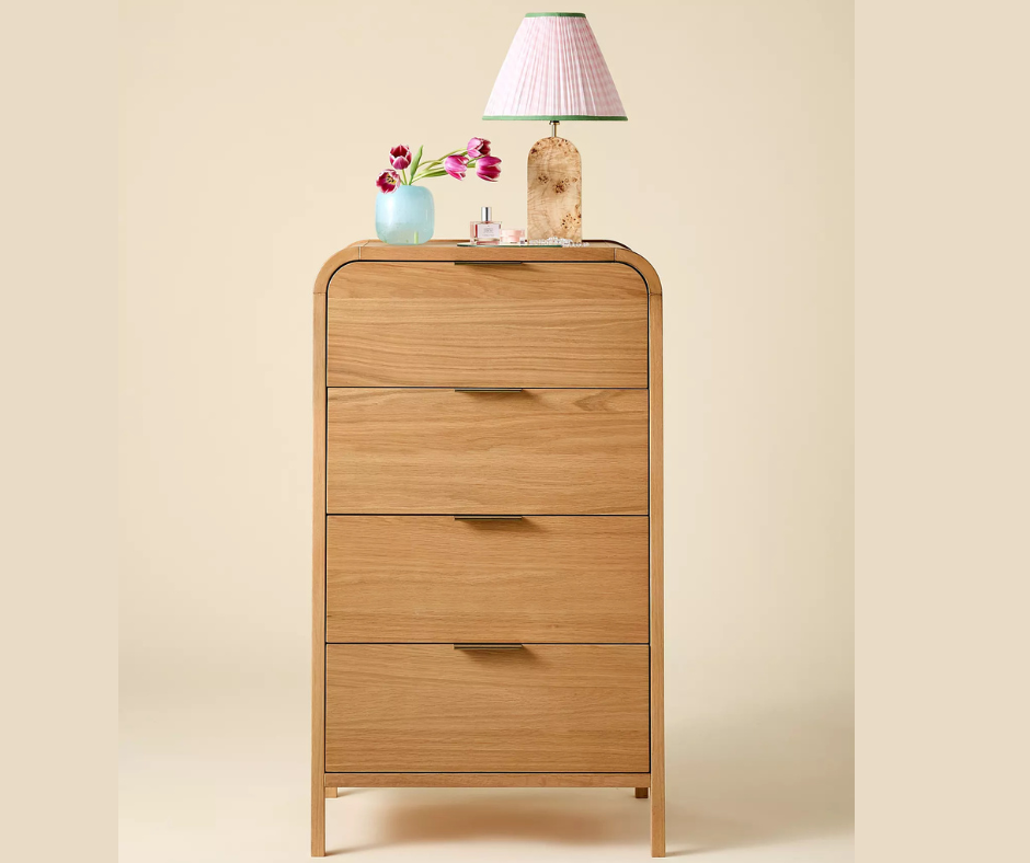 Commode moderne en bois massif avec des finitions peintes originales. Sa silhouette haute présente des angles arrondis pour une touche de douceur et quatre tiroirs spacieux montés sur glissières métalliques pour une utilisation optimale. Disponible en exclusivité chez Urban Outfitters.