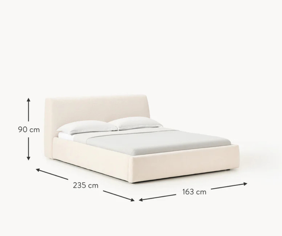 Surface du couchage : larg. 140 cm, long. 200 cm Dimensions globales : larg. 163 cm, long. 235 cm Tête de lit : larg. 163 cm, prof. 14 cm, haut. 90 cm Hauteur du sommier : 11 cm Pieds : haut. 3 cm Charge maximale : max. 300 kg (150 kg par côté)