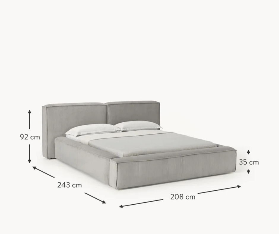 Surface du couchage : larg. 140 cm, long. 200 cm Dimensions globales : larg. 208 cm, long. 243 cm Tête de lit : larg. 208 cm, haut. 92 cm, prof. 24 cm Pièces de la tête de lit : 104 cm chacune, haut. 92 cm, prof. 24 cm Profondeur d’insertion pour sommier à lattes : 15 cm Hauteur du cadre : 35 cm Largeur du cadre : 18 cm Hauteur de rangement : 20 cm Hauteur de matelas recommandée : 18-20 cm Pieds : haut. 2,5 cm Charge maximale : max. 300 kg (150 kg par côté)